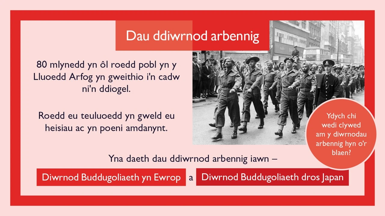 Dewch i ddathlu 80 mlynedd ers Diwrnod VE a Diwrnod VJ gyda straeon, lluniau a gweithgareddau syml. Darganfyddwch pwy sy’n ein cadw’n ddiogel, pam mae’r pabi yn symbol o goffáu, a’r gwahanol ffyrdd y gallwn gofio gyda’n gilydd.