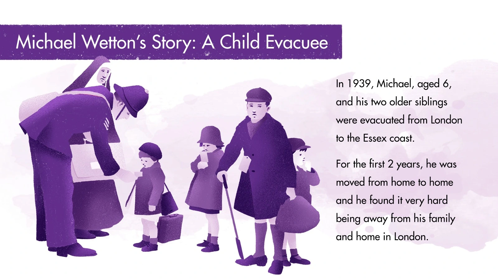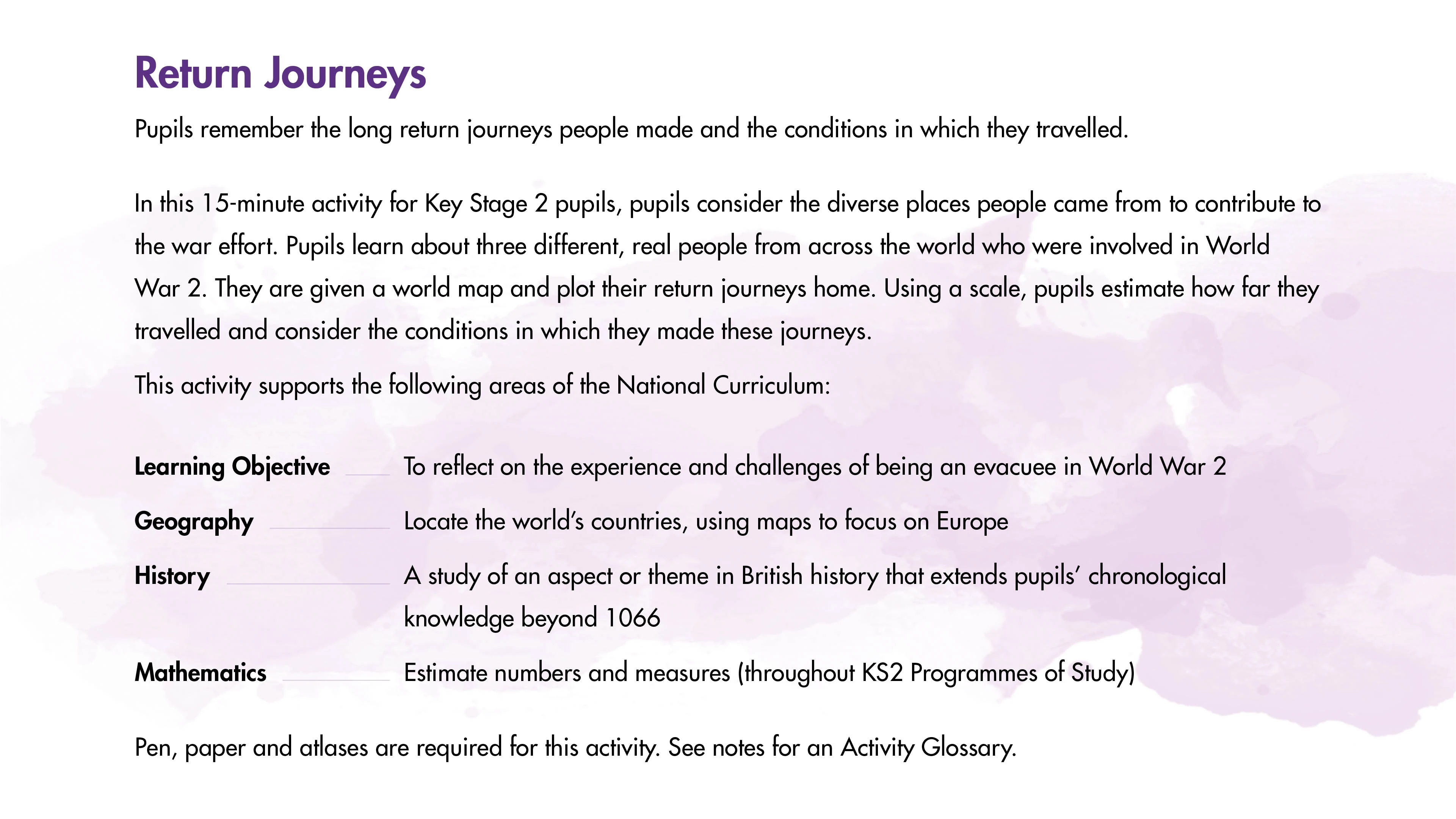 Pupils assume role of someone who left home in WW2, considering feelings of those left behind and writing a postcard describing their experience.