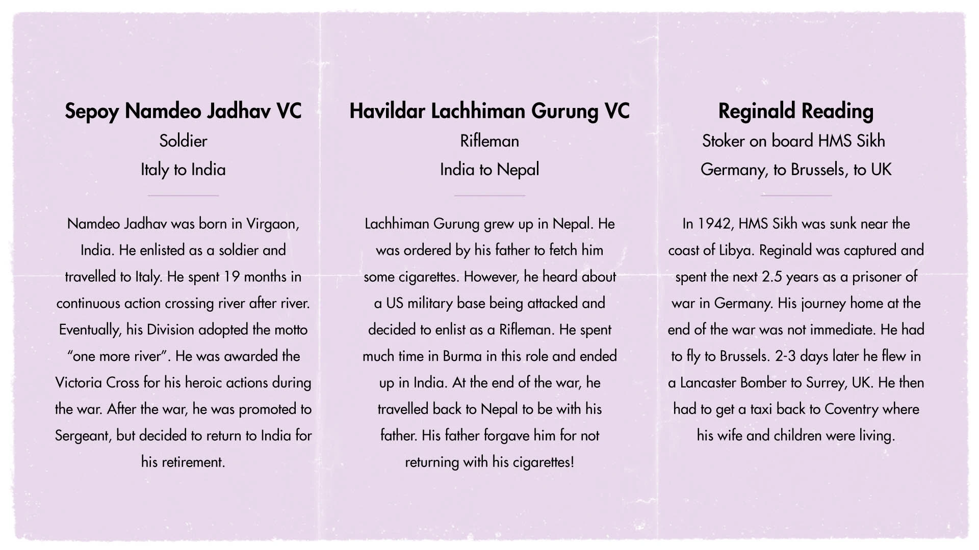 Travel across the globe with three men whose service in WW2 took them thousands of miles from home.